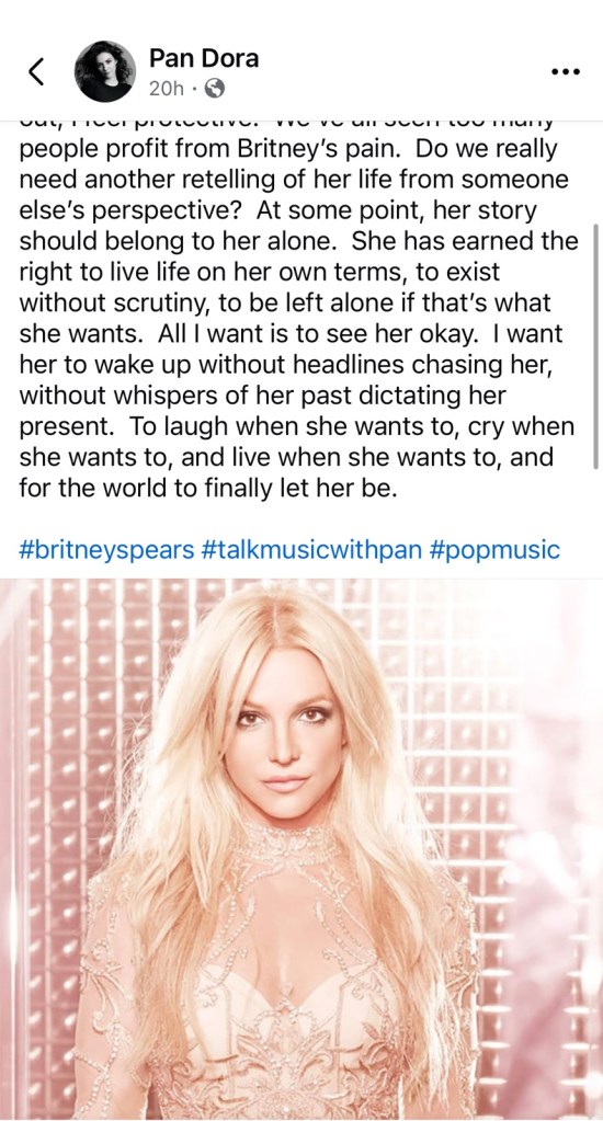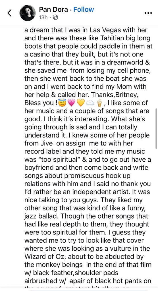 Nice I do agree , as long as she’s not picking up knives and trying to dance with them, looking like Ellie May Klampit on Crack w/ her make up smeared from the Beverly Hillbillies , she I thought is probably being drugged by her housekeeper that is probably receiving an extra bonus from someone on the outside in & made it look like she cheated on her husband Sam who she loved when she didn’t really intend to if they drugged her against her will, then maybe she was on auto pilot & or there was a doppelgänger that looks like her on camera. It’s difficult to say though at least I know Britney is a good person , deep down. I had a dream about her once so I was in a Tahitian boat w/ her at a Tahitian casino in Las Vegas, a few years ago , lost my cell phone in like a 24 person canoe Tahitian boat? she helped me get my cell phone back from losing it. It fell in the water & I couldn’t find it & she helped me to get my phone back so I could call my mom again. Bless her , Lol I had this dream like 4 or 5 years ago! I it was because we went to the MGM Grand went in the lazy river pool & so in my dream when I was asleep, I had a dream that I was in Las Vegas with her and there was these like Tahitian big long boots that people could paddle in them at a casino that they built, but it’s not one that’s there, but it was in a dreamworld & she saved me from losing my cell phone, then she went back to the boat she was on and I went back to find my Mom with her help & called her. Thanks,Britney, Bless you !😇💗💛☁️🍦, I like some of her music and a couple of songs that are good. I think it’s interesting. What she’s going through is sad and I can totally understand it. I knew some of her people from Jive on assign me to with her record label and they told me my music was “too spiritual” & and to go out have a boyfriend and then come back and write songs about promiscuous hook up relations with him and I said no thank you I’d rather be an independent artist. It was nice talking to you guys. They liked my other song that was kind of like a funny, jazz ballad. Though the other songs that had like real depth to them, they thought were too spiritual for them. I guess they wanted me to try to look like that cover where she was looking as a vulture in the Wizard of Oz, about to be abducted by the monkey beings in the end of that film w/ black feather,shoulder pads airbrushed w/ apair of black hot pants on the cover of greatest hit album or something, I was like no thank you dudes if that’s what you did to Britney , I’m good as an independent artist… Sayonara, Follow God ya ‘ know ! That album cover was like she was like 20 pounds thinner. Air brushed, than what she really looks like in real life. she was all looking like she was the queen of the monkeys of the Wizard of Oz vulture monkeys! lol, idk I thought 💭 they want me to look like they’re trying to make her look like she’s the daughter of the POD Prince of Darkness in England (Ozzy Osbourne) on Britney’s greatest hits album cover as Vilture Monkey Queen b/c I am not gonna do that , No way/No how , Sayonara … Jeeves …. Capeche, Lol I walked away from that record deal. I was like hell no no no , Follow Jesus ! I’m sure Britney agrees b/c like it looks like they made her look like one of the monkeys from the Wizard of Oz is gonna come down and grab her by the shoulder pads with the vulgar black vulture feathers& just pull her up into the sky to the top of the Wizard of Oz castle, then make her drink the blood of a virgin out of a cup, while wearing a jockstrap made out of a dinosaur bone ! 🤪Omg , that’s insane …& even I know that! Don’t try that at home kids ! According to the dumb man that raped me that ate squirrel pies , I’m just a dumb blonde so what do I know? To quote the lovely , Ed Sheeran Thank you , Pan Dora … we are off to neva neverland ! Peter