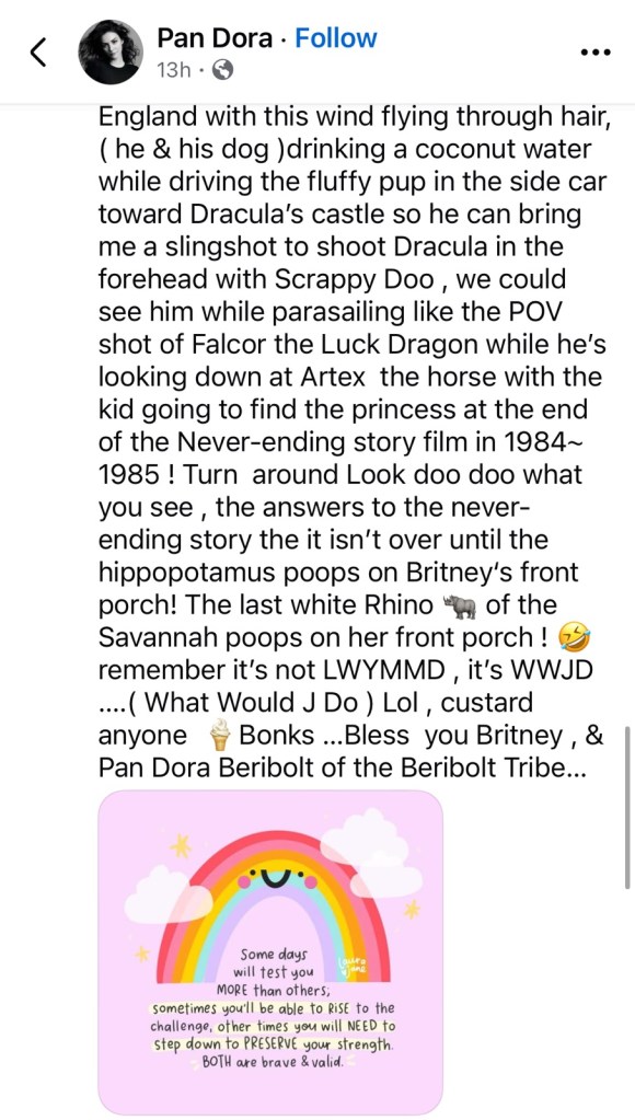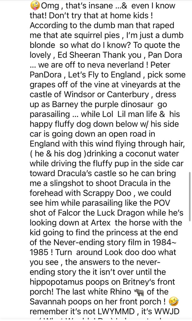 PanDora , Let’s Fly to England , pick some grapes off of the vine at vineyards at the castle of Windsor or Canterbury , dress up as Barney the purple dinosaur go parasailing … while Lol Lil man life & his happy fluffy dog down below w/ his side car is going down an open road in England with this wind flying through hair, ( he & his dog )drinking a coconut water while driving the fluffy pup in the side car toward Dracula’s castle so he can bring me a slingshot to shoot Dracula in the forehead with Scrappy Doo , we could see him while parasailing like the POV shot of Falcor the Luck Dragon while he’s looking down at Artex the horse with the kid going to find the princess at the end of the Never-ending story film in 1984~ 1985 ! Turn around Look doo doo what you see , the answers to the never-ending story the it isn’t over until the hippopotamus poops on Britney‘s front porch! The last white Rhino 🦏 of the Savannah poops on her front porch ! 🤣 remember it’s not LWYMMD , it’s WWJD ….( What Would J Do ) Lol , custard anyone 🍦Bonks …Bless you Britney , & Pan Dora Beribolt of the Beribolt Tribe…