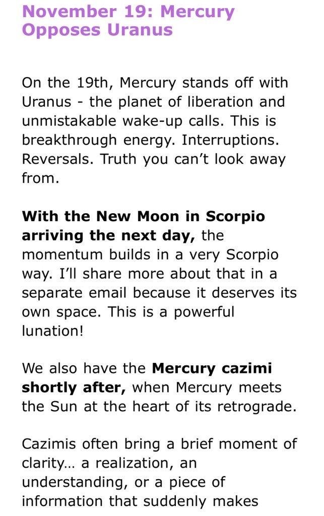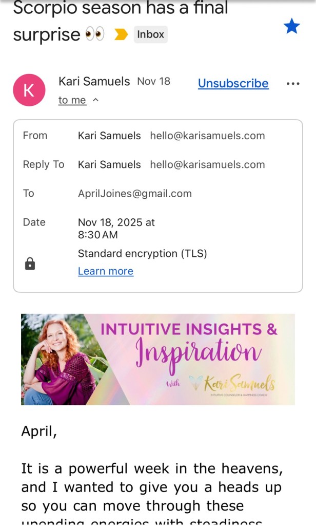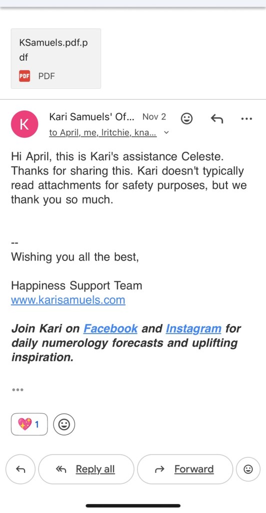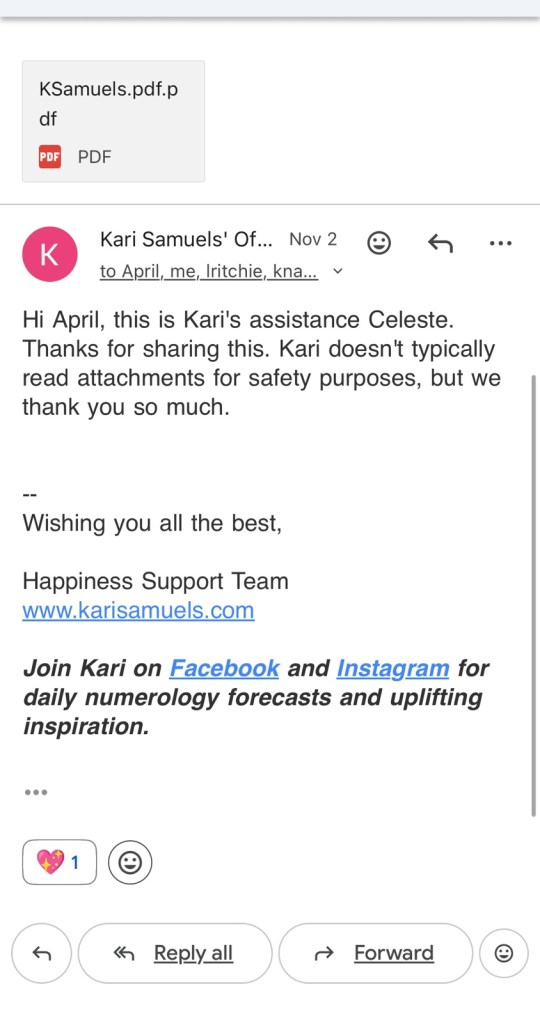So I emailed Kari Samuel’s on November 2 and then they Celeste Replied said they don’t read PDFs so I wrote it back on the 19th asking about a possible commission possibility today without sending a PDF: and reply to this email from her about the astrology forecast, I recommend subscribing to her channel because she’s an awesome astrologist, life, coach, and numerologist.