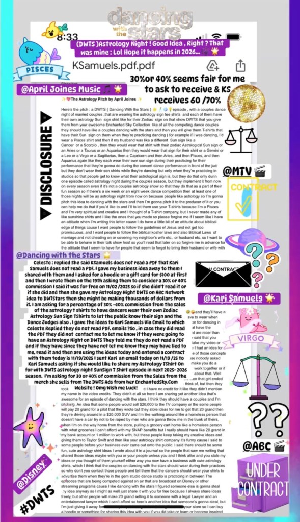 When dealing with the world of metaphysics and people thinking everything‘s OK in the angel world , If I was going to do something to help other people and wanted to be friends with you, you know I wouldn’t be sharing this idea with Kari if I didn’t love and care about her as a person I’m not trying to create drama for her business, But I am trying to have the same fair right as other people I just have a disability and she doesn’t and then all of these fairy people out in the new AG world ended up financially benefiting from business contracts because they have Zendesk accounts or they have an email that they advertise or they make the zoom call meeting and then they go into a contract and then I’m not a part of that and then I’m obsolete and then again like I come up with another great idea and then someone steals it I thought of some really cool ideas to make some cute astrology shirts about over a year ago and then enchanted guy came out like about a year in six months ago and I said someone’s gonna take my creative idea and I knew it was gonna be Carrie was gonna be interested in doing the same thing I did I don’t know how She came up with those ideas to make astrology shirts, but I know that I thought of them a year and six months ago, but I can’t get any compensation for that cause she made the business and made up the designs for them. I thought about doing that and tried to come up with some cool ideas, but basically those ideas that I have are now being things that some of the ideas that I had in the past like I can’t make money from other people stealing my creative ideas. It’s just not fair that they are making financial profit and driving around an SUV is going to like nice wonderful you know I don’t I don’t have the privilege of being able to go to Fiji island for or Mexico for the winter for like six freaking days or something once a year like I can’t even afford that and so it’s sad I could go on JetBlue somewhere if I had extra money in my account, but I don’t because people keep taking my creative ideas and then dang it to go on the vacation and drink their little tropical drinks with their little freaking umbrellas in them or go on their Disney cruisers or they get to go make more money off of a book that they can publish because they have money to publish their book with we and I don’t have zero in my account after I pay my bills so I would appreciate it if somebody could please get back to me with some truthful and honest information as to whether or not Mrs. KARISAMUELS has share the ideas with the DWTS on ABC before January 1 of 2026 !