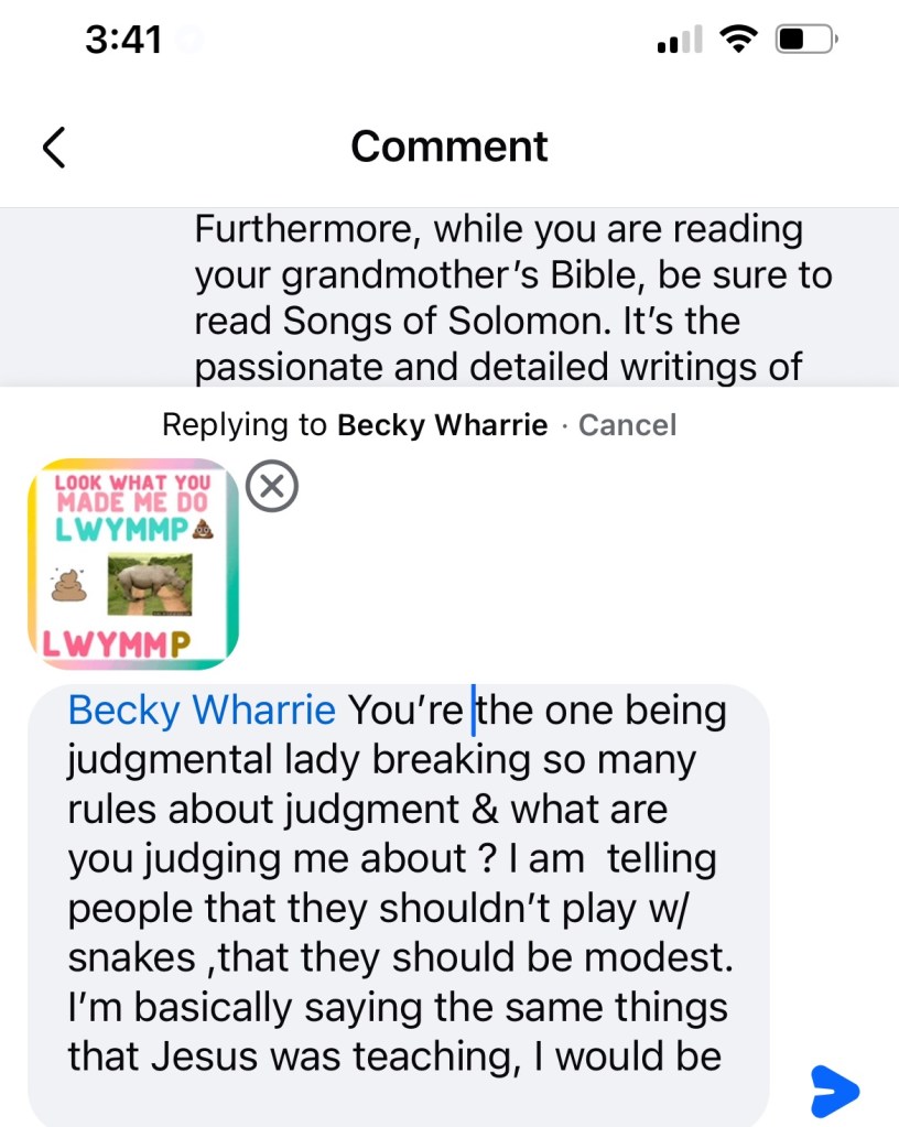 What about that is normal ? It’s not …. He was a lust hungry pimp , … and not obeying Mosaic Law Rules & He was a tyrant , he lost his morales and then Jerusalem became the best lil whorehouse . So no thanks , Becky I’m not going to read that book A Song of Songs by Solomon because I already know what it’s about. It’s pretty much like the closest thing to sex drugs and rock ‘n’ roll that the Bible has in it and I am aware that Jesus told Mary And to go and no more advocating people go enjoy each other’s bodies well let’s hope they do it in holy matrimony because what Solomon was doing was extremely wrong! So I’m not breaking any rules about judgment. So why don’t you go judge yourself, lady! Maybe you should go reread the book of Leviticus and the laws of marriage, in the early Torah that Moses had written : ….This is not good .