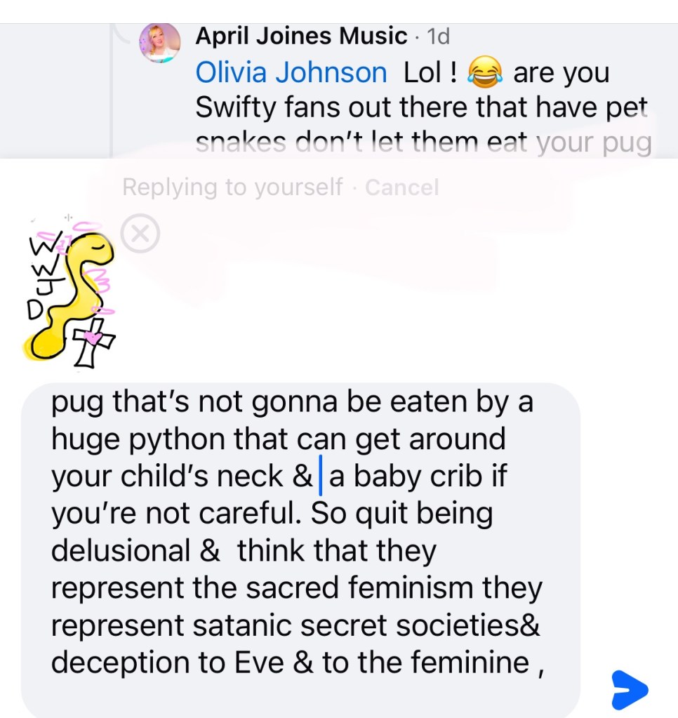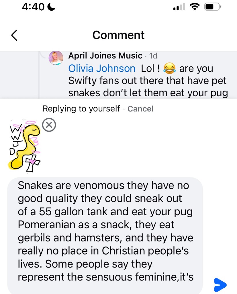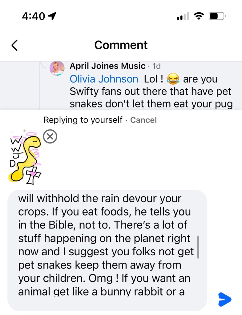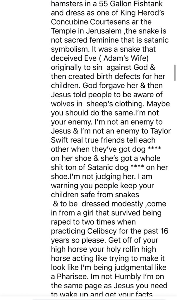 OK now sorry I had to come down hard on y’all but I do like Taylor’s fearless album her 22 album speak now lover album folklore album but I don’t like the video LYMMD and I think she should have it removed from the Internet so that kids don’t see it because it is borderline satanic if not satanic : it is , it’s sacrilegious..,,. and I don’t think Taylor is the same Mary so it would be best if she was just with humble herself a little and make an apology is what I think and that’s why I disagree with Olivia although she says go to a Bible study yes I study my Bible every day and can try to find those online, but I’m not so much worried about my own path on the Internet. It’s just children that come across things when they’re being sad or their influence from their older teenagers, brother or sisters that see those things and they are influenced by them and then they might falter on their spiritual path and think it’s OK to get a pet snake when that’s really a dangerous thing to do so I don’t encourage that. I think people should follow the biblical lot of Moses marriage and that people shouldn’t be following the doctrine of Solomon because he had 700 wives and 300 concubines and that was against the teachings of God so he was really being influenced by someone else and it might’ve been the devil so be careful you have to be aware of Wood and she clothing that’s all I’m saying and I am a fan of Taylor Swift and I like some of her duets that she’s done her lover album but I have I think cardigan is one of my favorite music videos of hers even though she’s taken some of my video ideas in the past or her people took the ideas for shake it off from me when I shared a conversation with my friend over the phone other people stole my ideas and gave them to her and I didn’t receive a mention or any credit she’s got 84 million followers and I have 30 such as a life of a Christian! Welcome to martyrdom ! Just writing about this is like committing career suicide if anybody says anything against Taylor, then you’re like good luck trying to become popular because she has 84 million followers, but I don’t care. I want to tell people the truth what is good for them and what is right and if I see someone doing something wrong, I’m not gonna just be quiet just to try to have more followers. I think it’s more important to do the right thing and the Bible says to speak the truth to each other and a be as bold as a lion, so that’s what I’m doing. Bless you on your path everyone , may God bless you and keep you safe ! ☁️☁️☁️💛☁️💗☁️☁️☁️☁️