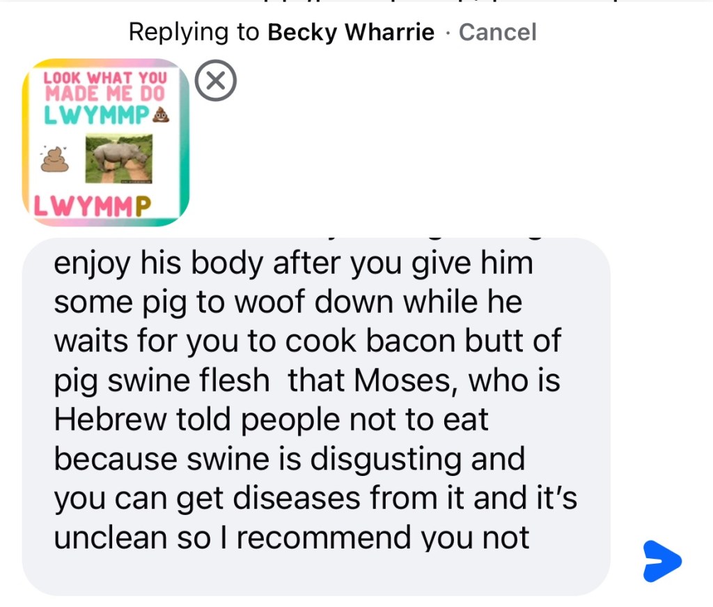 Typo : Eat a Big Ole Ham …Omg! So mean if you’re stupid enough to eat ham then you’re stupid enough to deserve to die from doing it. I’m such a judgmental Pharisee call me a Pharisee … I’m a Christian , you , and I’m just as mad as God was when he told Moses who broke the 10 Commandments to make sure they don’t eat pigs. I suggest you don’t.