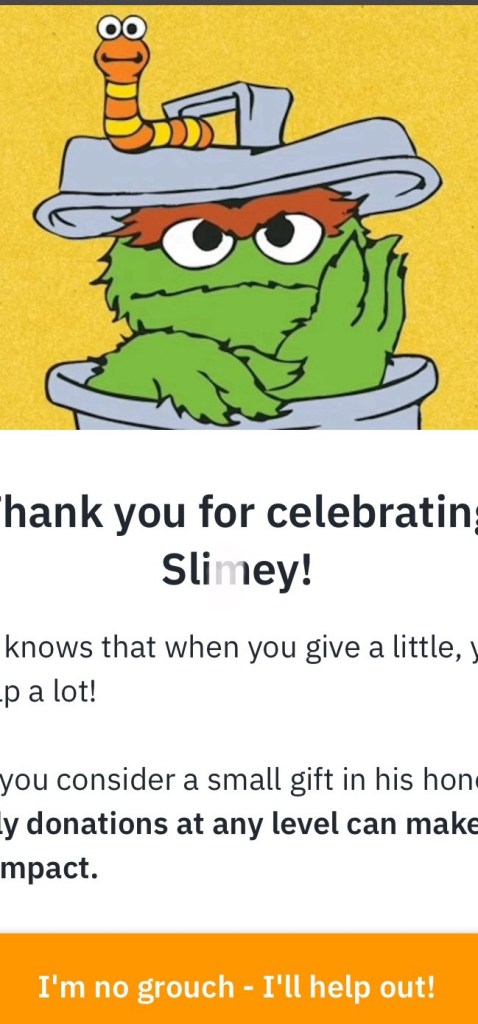 You be crazy George juju be crazy trying to give little children Tootsie Roll and you’re not to give them lollipops in motel on route one in front of life at night with little black Sambo in your car anymore , he is in heaven now, so I have a message for you. We have a message for you, Oscar the Grouch and happy worm, Mr. George of the jungle.