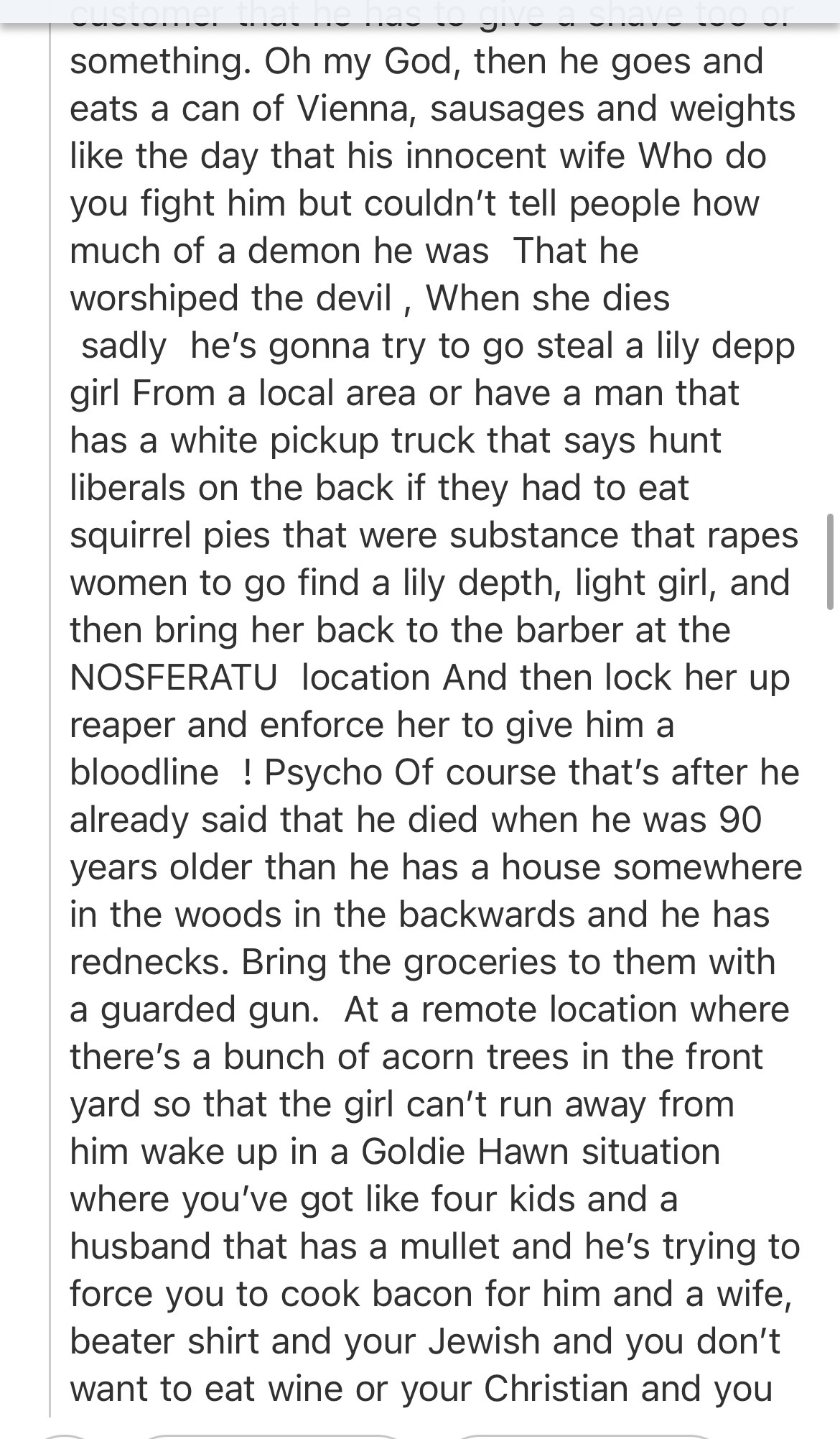 Oops, there’s a typo to eat wine and he’s trying to get you to cook bacon for him because he gave you amnesia and stole you raped you four times and then you wake up and he’s like hi honey. Where have you been sleeping? I just killed four pigs I need you to cook BLTs for us ! And you’re like a vegetarian and you wake up in a Goldie Hawn hostage situation and you were raped 4 times your husband had a mullet , and you are in the backwards because you were kidnapped by him and didn’t even get married to him. He stole you from your family then you have to kill your mullet head husband captor to get the hell away from there ! Yep ……