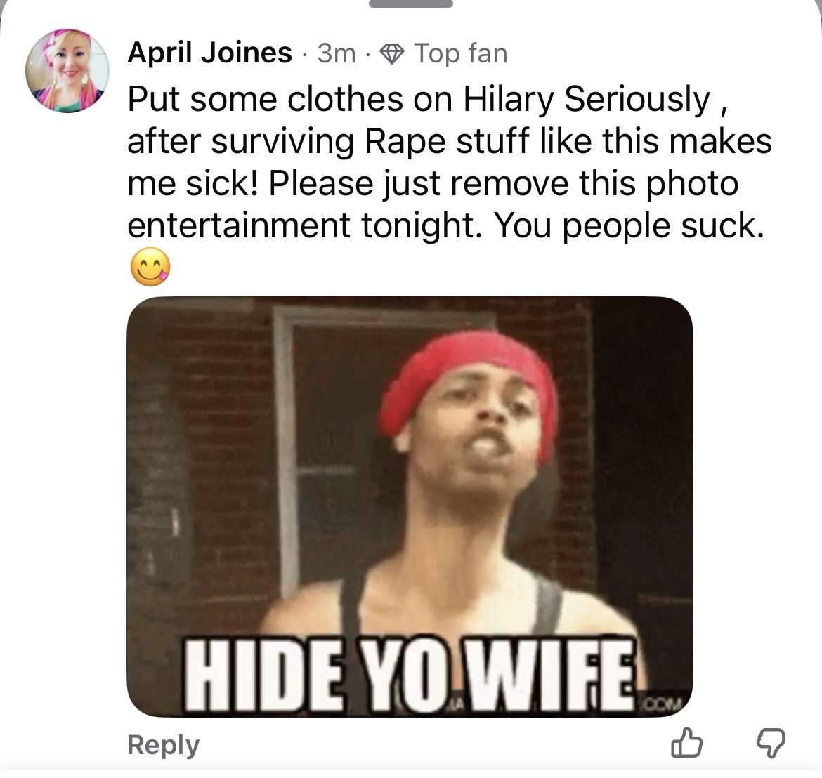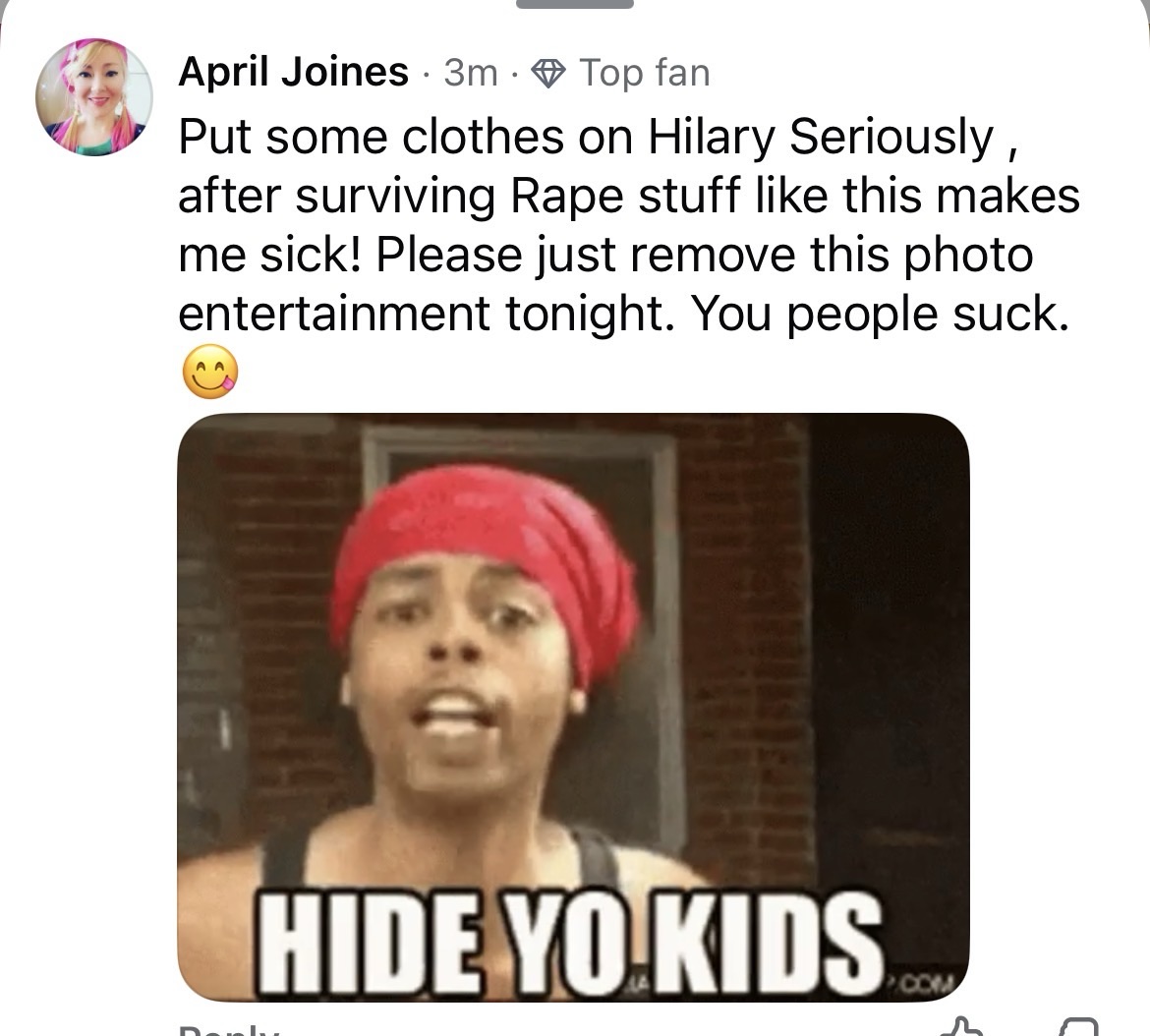 Yep , so do we have it folks, a beautiful white Caucasian female that thinks that she needs to have somebody looking down at her while she’s having a photo of herself not wearing any clues properly when she has more money than most people could ever dream of having why can’t you just put some proper clothes on? It’s like trying to encourage girls to dress like that take pictures of themselves that way and then they’re gonna get stalked by men that are gonna try to rape them. She’s not helping my life be any easier I care about Hillary I used to be a go guardian and that stuff is nonsense like put some clothes on. She looks a lot better when she has clothes on sure it’s just a shirt and some some thigh highs but that’s the problem. We don’t need to see that her husband should see not us ! Furthermore, like trying to talk about giving head in a dive bar is a good way to get an STD, and it’s inappropriate like trying to encourage people to do things like that: Gross! Hilary, are you trying to appear like you want to be in a hustler magazine or a play girl? Why is this even available to the general public on entertainment tonight it doesn’t make any sense?