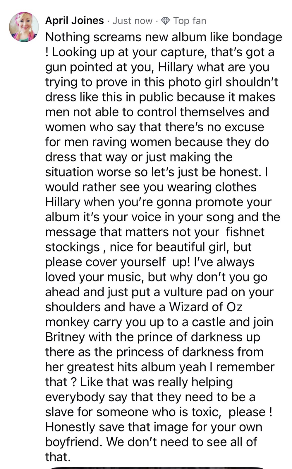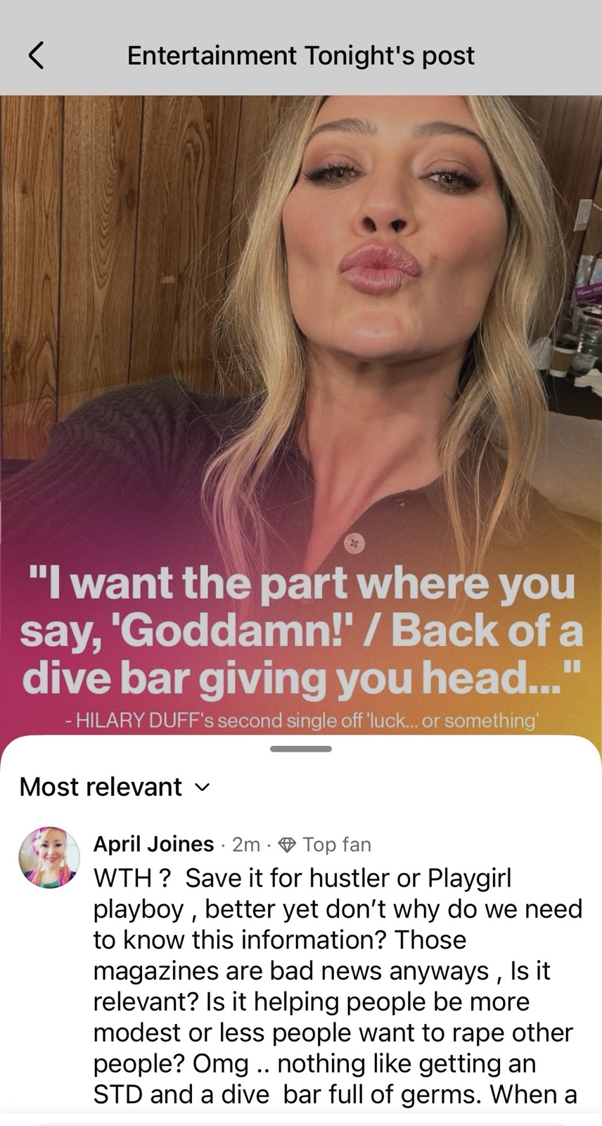 I still have respect for her previous album some of her songs I like a lot and movies very good person and talented actress and performer, but I don’t really like this at all so I am just saying like if I were trying to promote an album, I am not going to show a picture of myself like that because I did in my 20s had a gogo bar and I made a mistake of doing that like Jennifer Love Hewitt in the client. It’s not safe now I have stalkers in my early 40s because I had to work in the adult entertainment industry at a go-go bar. It is not a safe place for girls to be so I just wish that people could learn from those things that I learned from which is why I’m sharing this cause some people don’t know that if they just cancel clad like that, it’s gonna try a bunch of psychopaths and is that what she’s trying to do. I hope not. Maybe she can take some of my stalkers away from me cause I really don’t like need that kind of attention in my life. You know it’s like be careful Hillary and this is like defeating the purpose like telling people not to advertise these things within showing a picture of her advertising them while rebuking. It is like not something that I wanted to do because I’m having to bring attention to something that I don’t want there to be attention Bronx too but at the same time, I see girls sometimes scantily cloud out there, and it’s not wholesome. It’s not helpful to people that want their children to be modest and need their children to be safe in the world. I mean honestly. Just make better choices. Please don’t encourage girls to wear their lingerie in photos for everyone to see it makes voyeurism really prevalent. We need less of that in the world . Good luck with the new Album Hilary though you don’t need to have the provocative images to sell your music you are talented without making yourself looking like a stripper / prostitute / honestly …. Anyhow …. whatevs ! Still care about ya girl though please … be careful how you project your image and please be careful and safe not to encourage girls to expose themselves in that way / seems inappropriate….anyhow ! Such a pretty girl would probably have more record sold with proper clothes just my opinion . And please don’t talk about the divine sacred feminine being repressed with Mary Magdalene blah blah blah God , the Lord , will tell us the same thing puts them proper clothes on. Omg , Please…. have we learned nothing from Mary Magdalene…