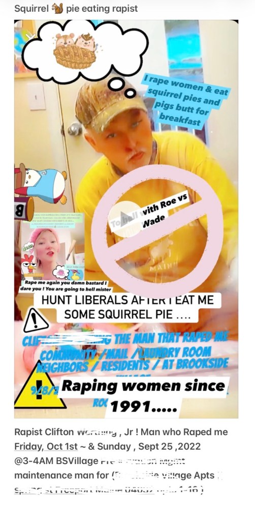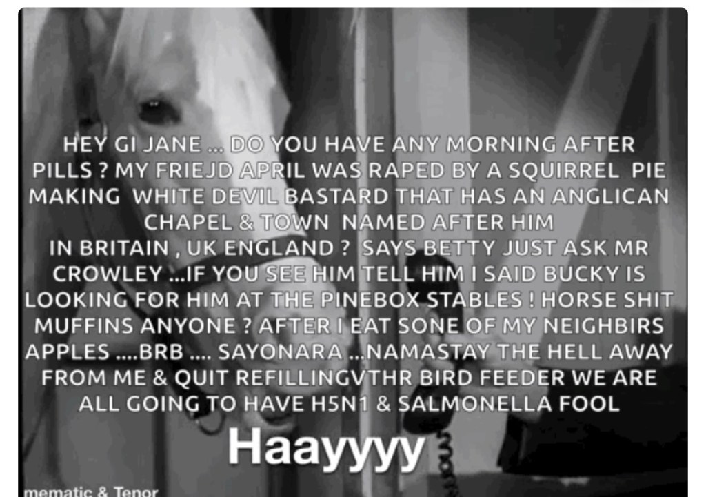 Hey Jane , if your husband ever tried a o rape me and his friend the squirrel pie eating bastard CW , Jr that you was convening with in the parking lot! tell em I said to get the hell off the lawn to quit eating squirrel pies . Never mind let them go ahead and get rabies , damn idiots.