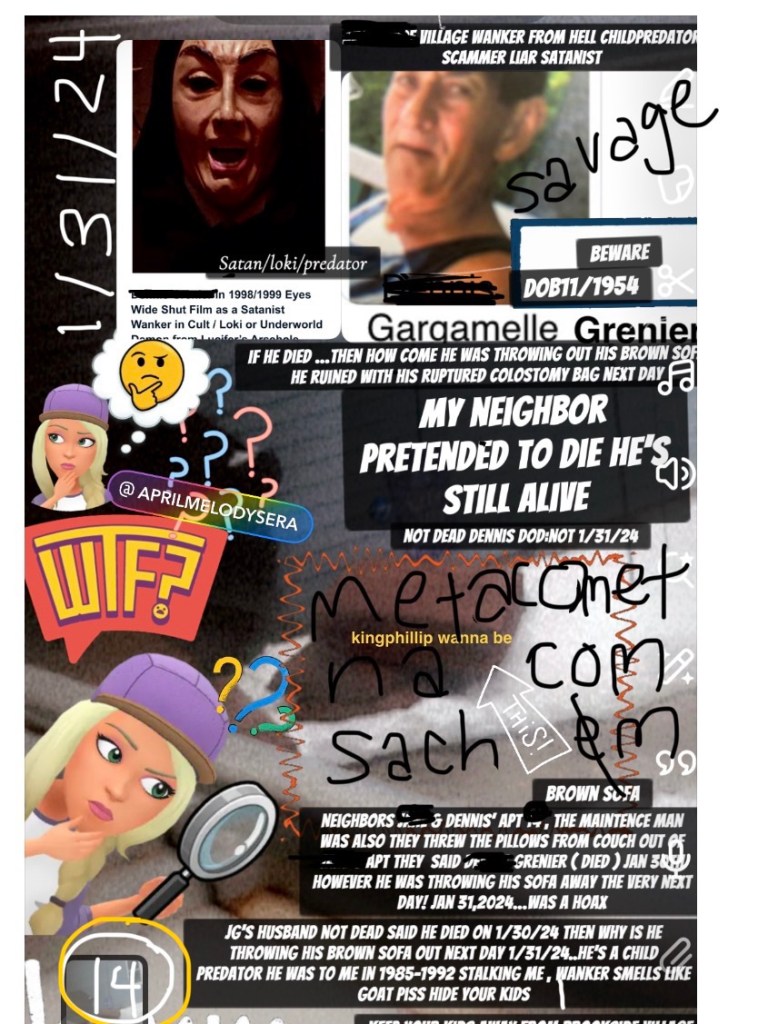 ausages so that he dies from eating swine and gets food poisoning and get stuck on the commode for the next 15 days. And then no, I never tried to hit her with a baseball bat folks because I didn’t own one in August. I didn’t know one I had a plastic wiffle ball bat but I did own a baseball bat a nice Easton that I had to bring back to the Wal Mart in February on the day of the Super Bowl when I was riding a bicycle around with a cute little stuffed animal I named sherbet. So she told a few of my neighbors that I tried to hit her with a bat bunny how I was just digging up a tree that was a winter tree in the front of apartment 15 to help make it possible for the glory to plant flowers in the spring time so that the 80-year-old woman that I gave my parking space too so she would have an easy walk pass to your front door and dug up trees that she said she was going to in the spring time so that she wouldn’t have to and after I removed those trees so that she had more space in her flower bed with her daughter-in-law to plant some flowers, this lady accused me of trying to hit her with a baseball bat and then I forgive her, but I am not gonna forgive her creepy husband, so I guess he just didn’t want people to know he was an eyes wide shut, so hey everyone he was in eyes wide shut! That creepy film in 1998 because he’s probably in real life a state worshiper unlike Tom Cruise and Nicole Kidman that were just playing in a movie as actors in his real life. I can’t stay the same for him. Maybe that’s why there are pentagram lanterns in our village after he arrived what’s he trying to do make everyone worship stay in here I’ll kill him. If he comes out his front door. I’ll leave Jane alone cause I’m not gonna lose my freedom and go to jail for her. Hell no I’m not that dumb.