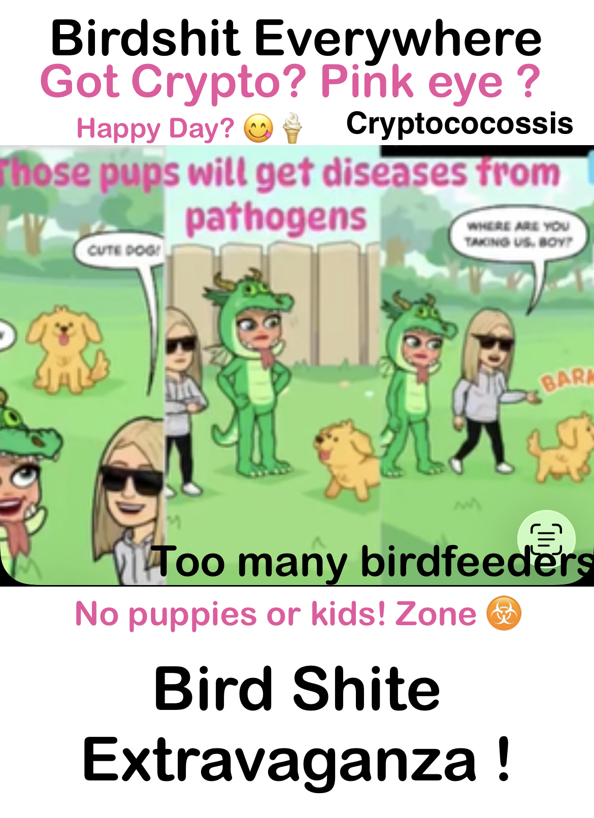 Hey everyone want to the bird shit villa and get salmonella, cryptococcosis histoplasmosis , H5N1, and the good old case of salmonella for you, your dog, your kids and your granny?