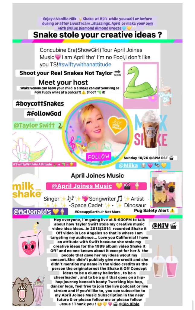 April Joines Music đľ Taylor Swift Kanye West Kim Kardashian MTV McDonald’s Milka #swiftywithanattitude #LOL #OMG #swiftywithanattitude #AprilJoines #fyp㡠#fypăˇăviral㡠#fypage㡠#KanyeWest #taylorswift #swifty #swifties #Swift #snake #puglife #PugSafety #KingHerod #BoycottSnakes #ShootDemSnakes #SamuelJackson #SamuelJacksonSnakesOnAPlane #SnakesOnaPlaneSamuelGonnaShootThemToBeSafe #KingHerodConcubineEra #KingHerodCourteseanEra #GoGo #TSwift #SwiftiesUnite #AprilFools #AprilFoolsNoOne #shakeitoff #MilkShake đ¸đđĽAsk an adult to shoot the snake so it will not kill your pug or your Pom Puppy( Do not play with guns ) #safetyfirst #SwiftSnakeDisclaimer Loulou the pug đžđđ On 10/26 @8 PM ~9PM April Joines will be discussing how people in the music business industry stole her creative music, video ideas and concepts for Taylor Swiftâs â Shake It Off â video from her 1989 album. April had those ideas five years before they became popular in her music video. She did not give Taylor Swift permission to borrow them and become famous with them. Taylor was already famous from her fearless album as well as her Red album, and her Reputation Tour ( That I referred to United Snakes of America era) if she didnât steal those ideas intentionally I wouldnât be surprised. She quoted me in the song â22â on her red album when I was speaking with my bff about some of the ideas I had for a music video while I was enrolled in full-time cruises online at a community college working toward my BA Education degree to become an elementary school educator, Ms. Swift I was told she was like me and wrote songs. My friend said there was âa girl like you that write songs named Taylor Swift.â⌠my reply was : âWho is Taylor Swift Anyways? Ew, !â .. being sarcastic, of course, and playful. I had no idea she was going to steal my creative ideas five years later when in the same phone conversation, I told my friend that I wanted to pursue a music career during the summer record my songs and albums record them when Iâm not teaching during the school year. I didnât graduate because of family emergencies and personal life issues and has been taking time off from school coping with PTSD and Bipolar Depression recovering from domestic violence/rape/ & honestly losing a loved ones to cancer and another loved one to substance problems . Thankfully, my loved one is recovered from cancer and my other family member has become sober and drug-free. I I have been thinking of going back to school while still songwriting though I canât do both at the same time so Iâve just been focusing on music and writing. I thought I would go ahead and share some info since I waited 10 years before saying anything about those Concepts from Shake ~ It ~ Off being my music video Ideas and concepts for my own album. Iâm not kidding . Iâm not trying to get fame. Iâm not trying to have Taylorâs followers. I could care less about being famous. I just like writing songs and music and itâs fun to share music and I went to collaborate with some of my favorite artists and record my album before I die , if possible. It does hurt my feelings that Taylor Swift stole my creative ideas without inviting me to be a part of music video and she didnât ask my permission to take my creative ideas in concepts, which were being a clumsy ballerina, a cheerleader ,